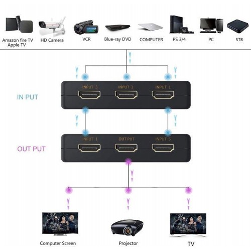HDMI Switcher can remotely switch at your will from distance with the IR wireless remote transmitter, the receiver plug into the device, allows you to simply sit back and wireless switch the signal within those devices. By the way, manual button on the HDMI switcher can also switch between devices.